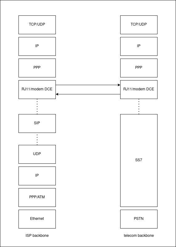 Fig. 3 is to model the underlying technologies stack used for the supporting SIP session and RTP stream (upstream ISP backbone and telephone operator’s backbone), modem-to-modem handshake (drawn as arrows) and established PPP link with TCP/IP implementation.
