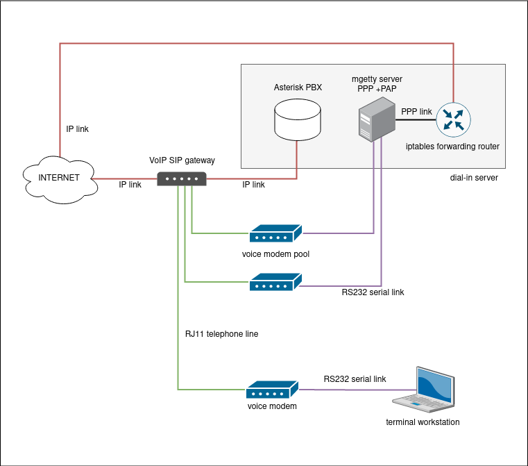 Annotation: Telecommunications laboratory (telco lab) is the next step in the old hardware collection’s further usage and analysis. About 10+ various [mainly U.S.Robotics (USR) branded] voice 56kbit (fax)modems for dial-up Internet connection had been collected. This article gives a Prove of Concept (PoC) to the modem-modem link establishment over the VoIP RTP stream with aim to build a dial-in ISP service. Various VoIP technology’s underlying parameters, and modem configurations had been tuned with batch dial-up connection testing being executed, and then commented. Tests were performed with the usage of remote SIP operator’s circuit, and local PBX SIP circuit.