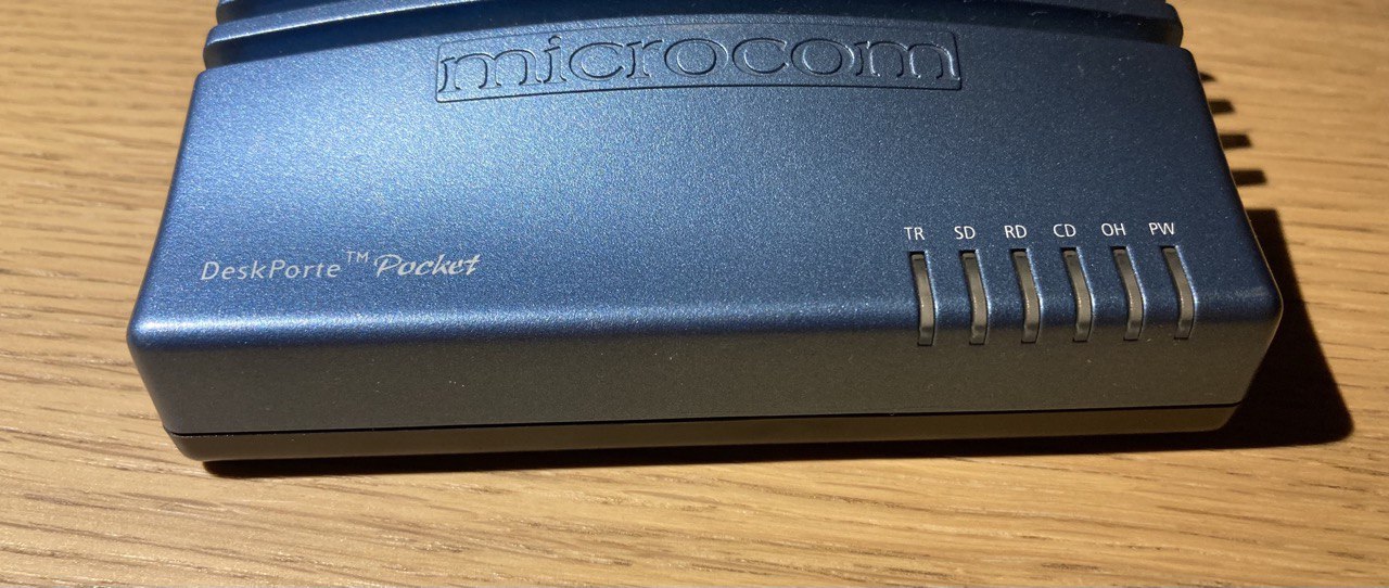 Tiny blue external modem, reproductors are failable, thus the negotiation(s) are tough to follow. Has a DB9 serial interface as the only modem used.