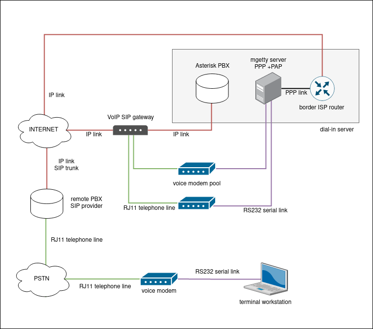 In the first case, the SIP server is located at the remote operator/provider’s network with the corresponding remote PBX. A client (and client’s modem) uses PSTN and POTS socket to dial the dial-in server’s modem.