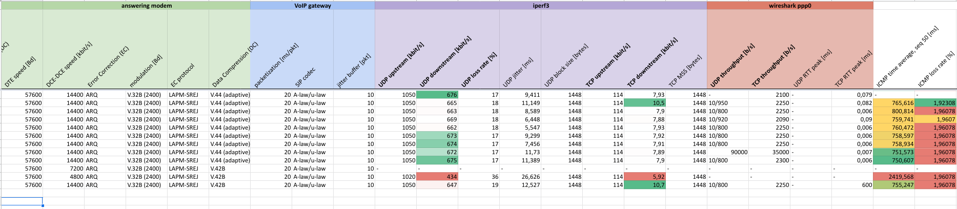 For both configurations, Well ATA172 is used as SIP gateway. Scraped data are stored in digitalized spreadsheet, with just-changed parameters emphazing (to see testing-time changes).