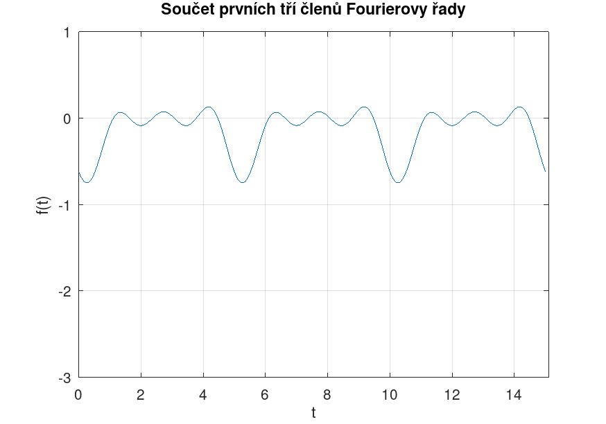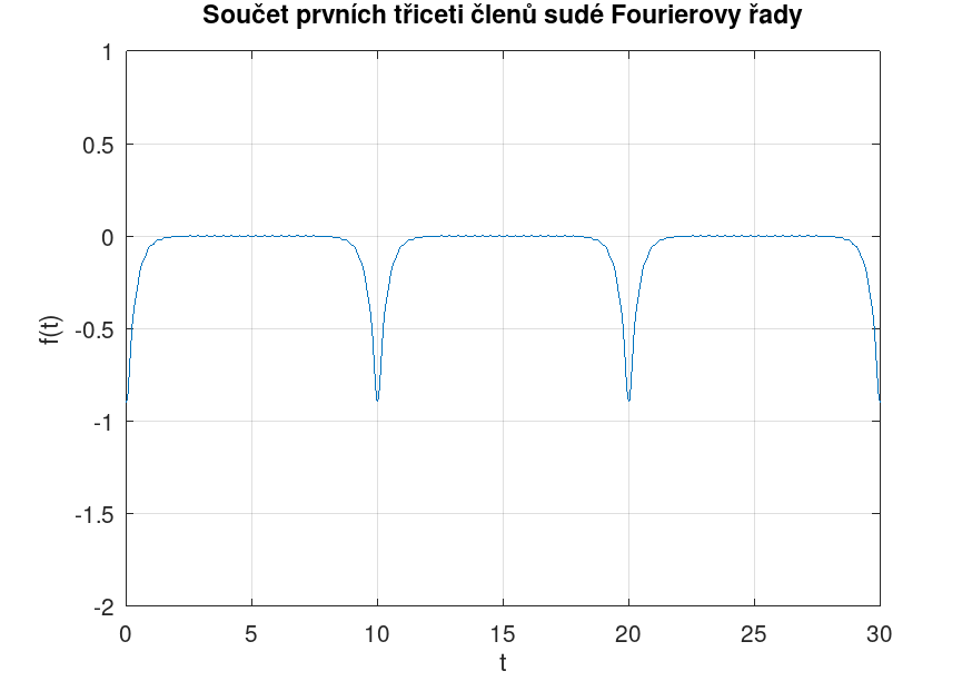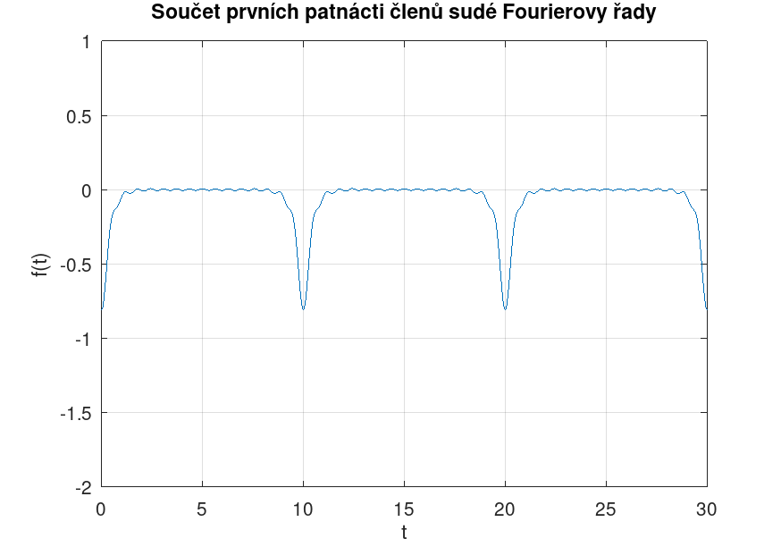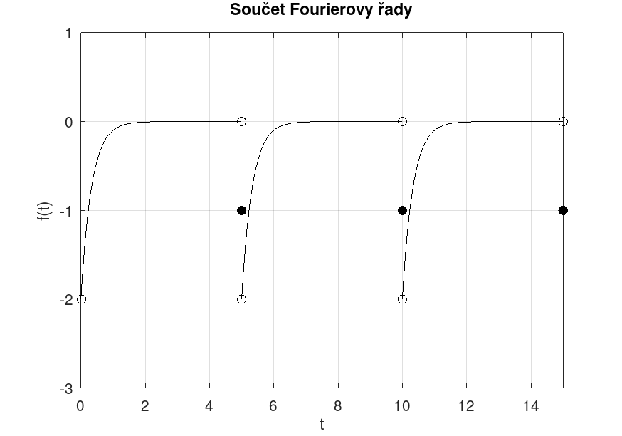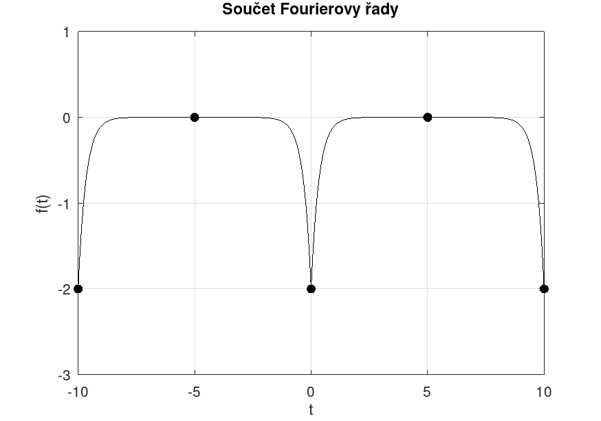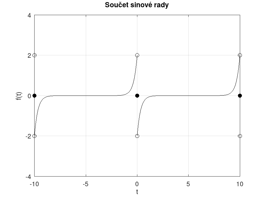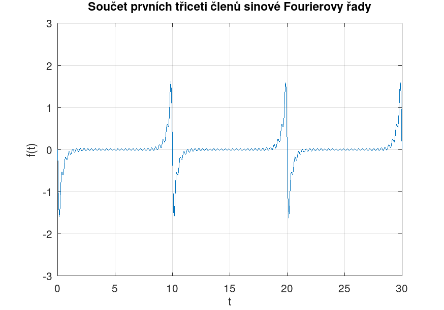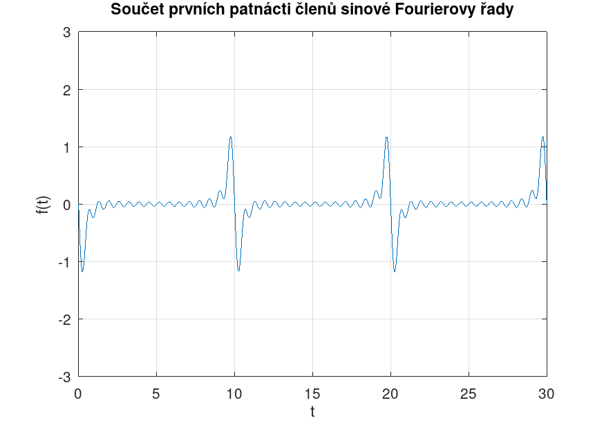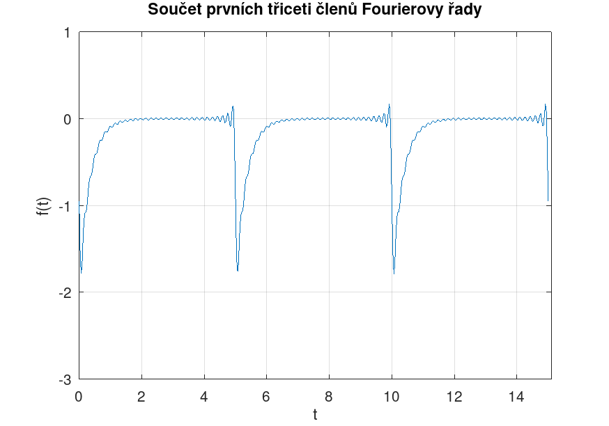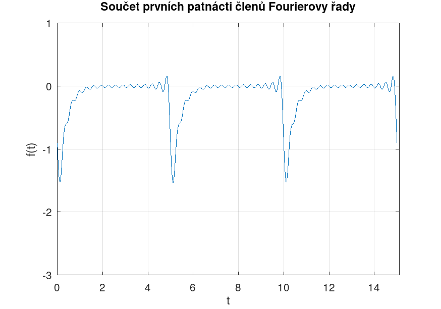 Na okrajích periody funkce \( f(t) \), která byla vyjádřena jako Fourierova řada, je patrný tzv. Gibbsův fenomén (přestřelení hodnoty funkce).
