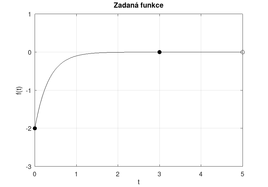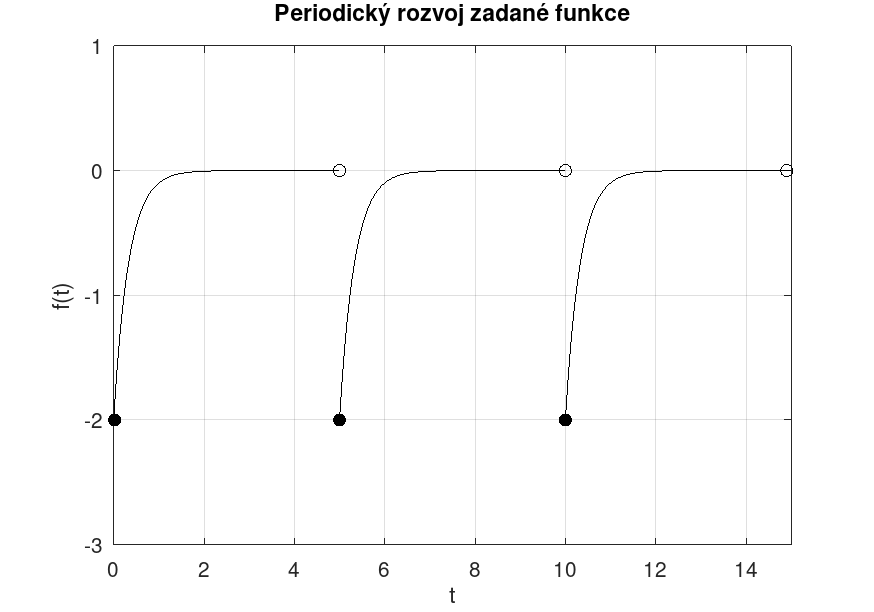 Buď \(T = 5\) a buď \(f\) taková \(T\)-periodická funkce, že platí: $$ f(t) = \begin{cases} -2e^{-3t}, & t \in \lbrack0, 3), \\ 0, & t \in [3,5). \ \end{cases} $$