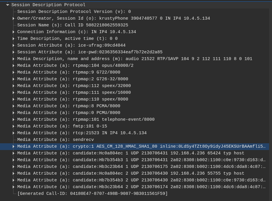 - SRTP-DES exchange, SIP VoIP, SDP session descriptor, RTP stream description (codecs, media type, ports, SRTP master key in bae64) in SIP signalling