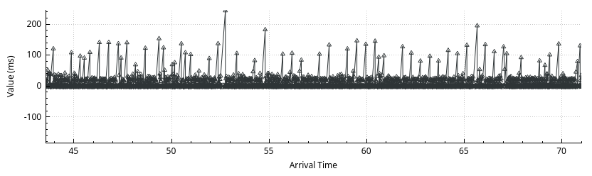 When we go Telephony » RTP » RTP Stream Analysis » Graph, we can see the time fluctuation of the RTP stream.