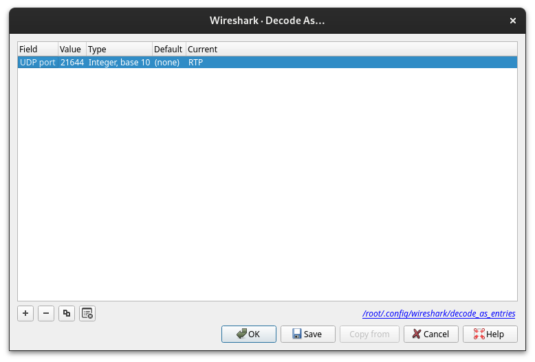 Next step there is to decode UDP stream as RTP stream by click on the random UDP packet and choosing Decode As…, and double-clicking on the UDP row and Current column — from the options do choose RTP.